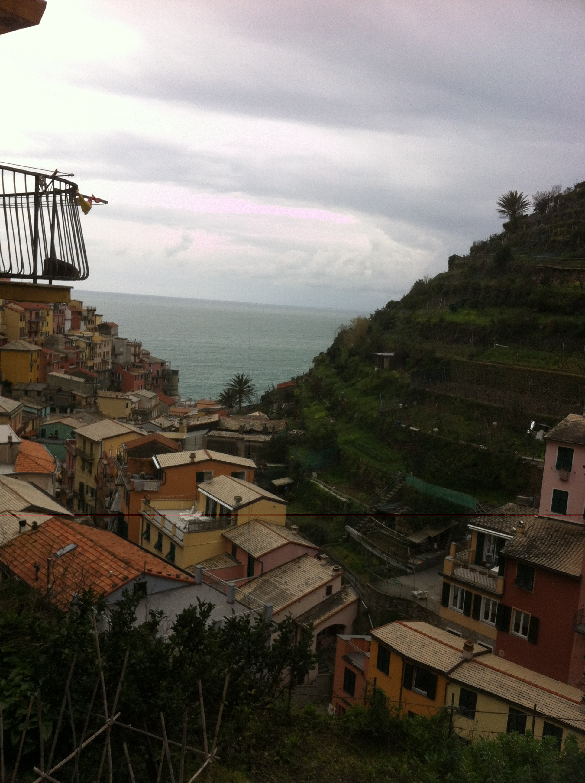 Varje morgon fylls de små byarna med folks som skall stiga på vandringsleden. När kvällståget gått var det nästan tomt på turister. Förklaringen till det är att det är mycket dyrare att bo inne i någon av de fem byarna, än utanför i La Spezia till exempel. Vi valde den sydligaste som heter Riomaggiore – en pittoresk liten ort som kokar av italienskt vardagsliv. Vackert klädd i terrakottafärgade, bulnade väggar som med åren dämpats av outtröttliga salta vindar och havsluft. Uppe på höjden, en bit ovanför tvättlinorna, finns en kyrka från 1300-talet och en borg som är byggd ännu tidigare.
